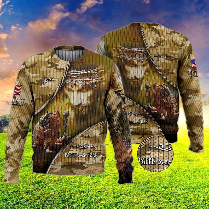 Rushgleam Veteran Faith Over Fear Ugly Christmas Sweater American Flag Soldier Cross Christian Gift