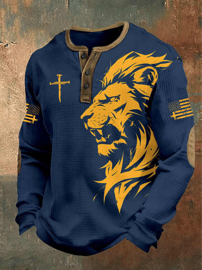 Men’s Faith Henley Long Sleeve Shirt Lion Graphic American Flag Print Shirt Christian Gift