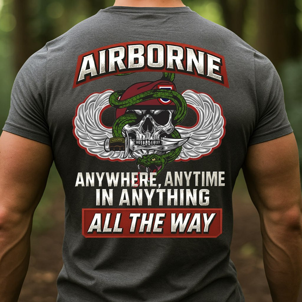 Skull Airborne Veteran T-Shirt Anywhere Anytime All The Way Clothes Presents For Veterans Day
